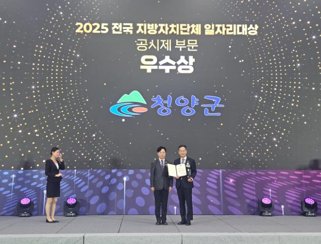 [메이저뉴스]청양군은 지난 30일 청주오스코 2층 그랜드볼룸에서 열린 고용노동부 주관 ‘2025 전국 지방자치단체 일자리대상’ 공시제 부문에서 우수상을 수상했다고 밝혔다.