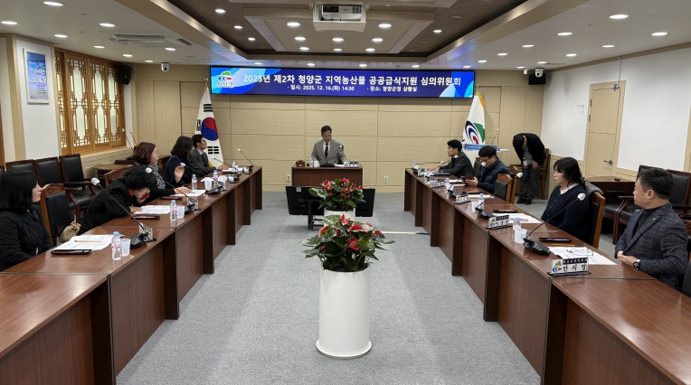 | ▲ 지난 16일, 청양군 공공급식 추진방향과 2026년 지원규모를 논의하기 위한 청양군 지역농산물 공공급식지원 심의위원회를 진행하고 있다. |