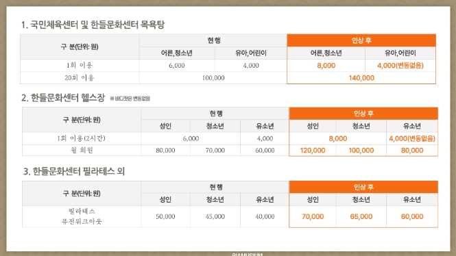 국민체육센터와 한들문화센터 내 목욕탕 1회 이용요금은 2,000원, 20회 이용요금은 4만 원 인상된다.