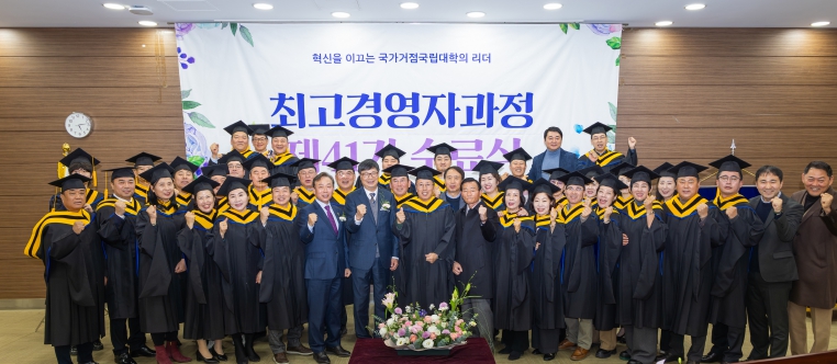경영대학원 정대율 원장은 “경상국립대학교 최고경영자과정 41기 원우 여러분은 지역사회와 국가 발전에 공헌하는 혁신 리더가 되기를 바란다.”라면서 “우리 대학 각 동문회 가운데 가장 단합이 잘되는 동문으로서 대학과 지역사회에서 선한 영향력을 행사해 주기를 바란다.”라고 말했다.