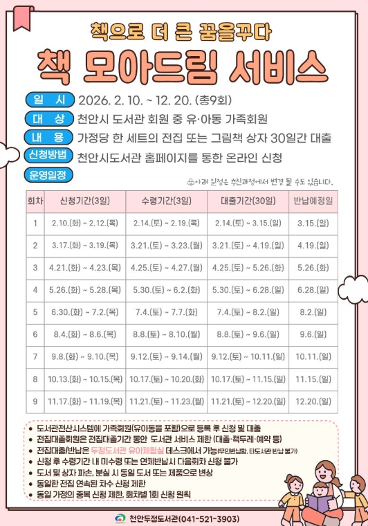 참여를 희망하는 가정은 천안시도서관 누리집을 통해 온라인으로 신청하면 된다.