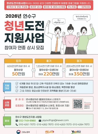 [메이저뉴스]연수구는 청년들의 경제 활동과 노동시장 진입을 돕기 위해 ‘2026년 청년도전지원사업’ 참여자를 모집한다.