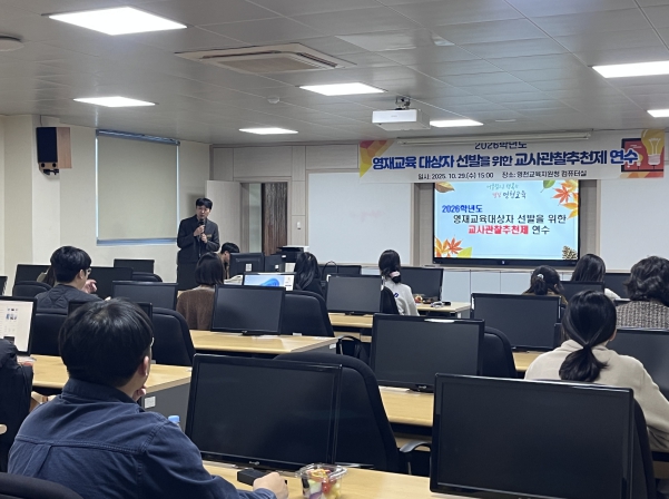 [메이저뉴스] 경상북도영천교육지원청은 10월 29일 오후 3시, 영천교육지원청 3층 컴퓨터실에서‘2026학년도 영재교육대상자 선발을 위한 교사관찰추천제 연수’를 실시했다.