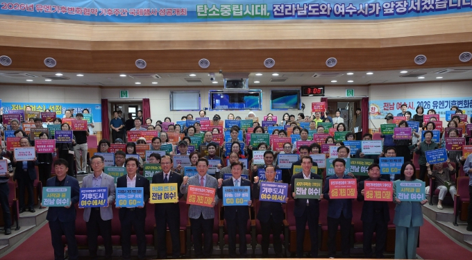 [메이저뉴스]여수시는 지난 14일 진남문예회관에서 ‘2026년 유엔기후변화협약(UNFCCC) 기후주간(Climate Week)’ 국내 개최 후보지 선정을 기념하는 행사를 열고 유치를 위한 의지를 다졌다.