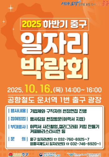 [메이저뉴스] 인천시 중구는 오는 16일 공항철도 운서역 1번 출구 앞 광장에서 ‘2025 하반기 중구 일자리 박람회’를 개최한다고 밝혔다.