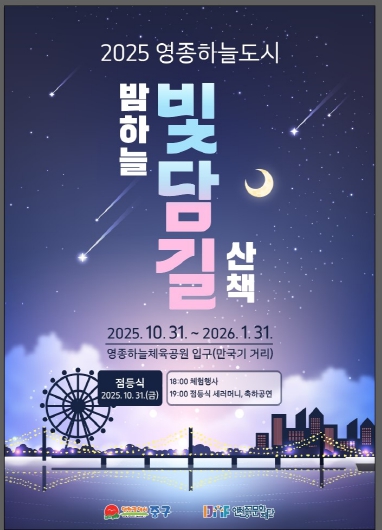 [메이저뉴스](재)인천중구문화재단(이사장 김정헌)은 올해 10월 31일부터 오는 2026년 1월 31일까지 3개월간 야간 경관조명 ‘2025 영종 빛 축제 - 영종하늘도시 밤하늘 빛담길’을 운영한다고 밝혔다.