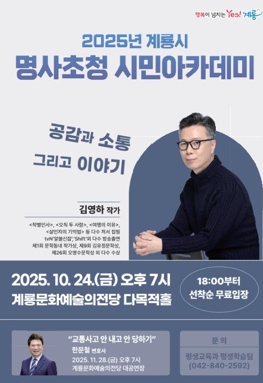 한편 계룡시는 오는 11월 28일에 한문철 변호사를 초청해 ‘교통사고 안 내고 안 당하기’라는 주제로 두 번째 명사초청 시민아카데미를 개최할 예정이다.
