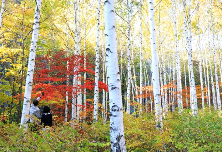 빼곡하게 수놓인 나무의 하얀 수피들 사이로 알록달록 피어오른 단풍은 늘상 봐오던 단풍나무들과는 색다른 감동을 선사할 것이다.