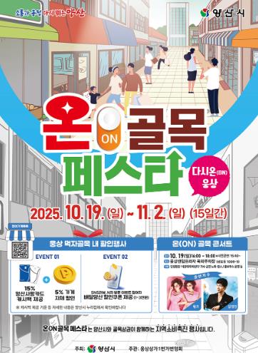 이와 함께 양산시는 오는 10월 19일부터 11월 2일까지 15일간 서창동 삼호로 일원에서 골목상권 소비 촉진을 위한 ‘제4회 온(ON)골목페스타-다시온(ON)웅상’을 개최한다.