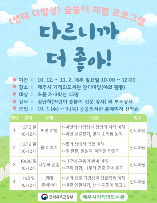 프로그램 신청은 10월 1일부터 제주특별자치도 공공도서관 누리집을 통해 선착순으로 접수하면 된다.