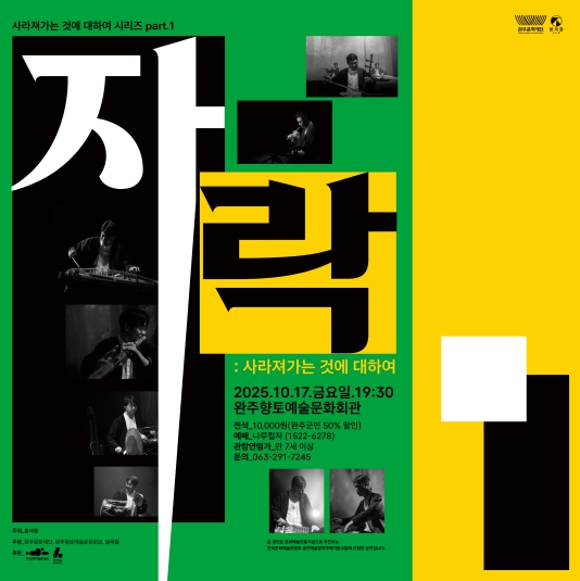 [메이저뉴스]전북 완주군에 깊어가는 가을밤, 사라져가는 토속 민요의 숨결을 현대적인 감각으로 재조명하고 재해석한 특별한 국악 공연이 펼쳐진다. 완주문화재단은 오는 10월 17일, 완주향토예술문화회관에서 국악앙상블 불세출의 '자락: 사라져가는 것에 대하여' 공연을 개최한다