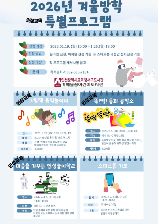 [메이저뉴스]인천광역시교육청서구도서관은 ‘2026년 겨울방학 특별프로그램’ 학습자를 19일 오전 10시부터 선착순으로 모집한다.