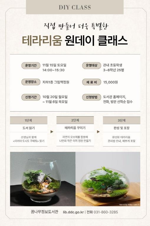 [메이저뉴스]동두천시 도서문화사업소 꿈나무정보도서관은 오는 10월 20일부터 초등학교 3~6학년을 대상으로 『테라리움 만들기』 원데이 클래스를 운영한다고 밝혔다.