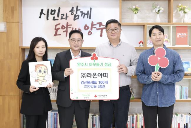 [메이저뉴스]양주시가 지난 15일 옥정동에 위치한 사회적기업 ㈜라온아띠에서 김선물세트 100개(200만 원 상당)를 기탁받았다.