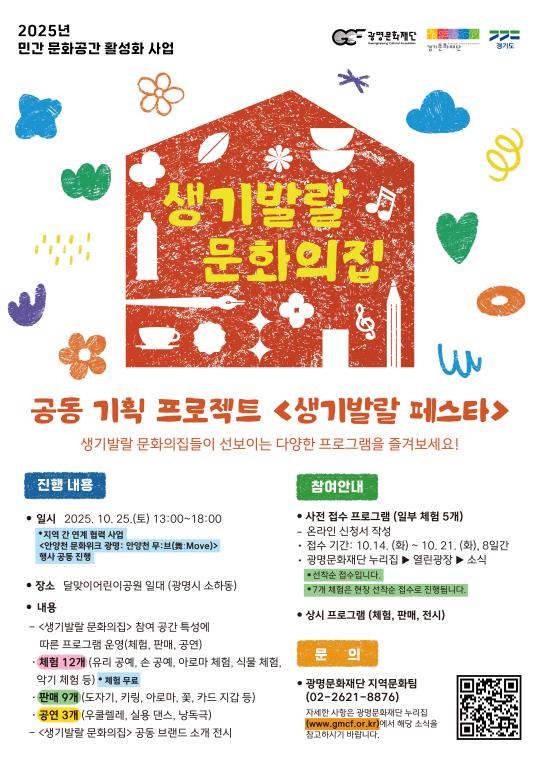 [메이저뉴스](재)광명문화재단은 2025년 민간 문화공간 활성화 사업 '생기발랄 문화의집' 공동 기획 프로젝트 ‘생기발랄 페스타’를 10월 25일 오후 1시에 달맞이어린이공원에서 개최한다.