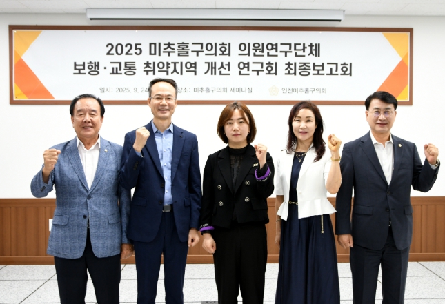 [메이저뉴스]인천광역시 미추홀구의회 의원연구단체 '보행·교통 취약지역 개선 연구회'(대표의원 박수연, 연구의원 장규철·배상록·김태계)가 2025년 9월 24일 미추홀구의회 세미나실에서 연구용역 최종보고회를 개최하고 성공적으로 마무리했다.