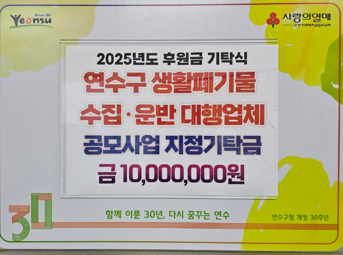 연수구 관계자는 “쾌적하고 깨끗한 도시환경 조성을 위해 힘쓰고 있는 연수구 생활폐기물 수집·운반 대행업체의 따뜻한 나눔에 감사하다.”라며 “전달받은 성금은 도움이 필요한 이웃들에게 소중히 전달해 따뜻한 위로와 희망을 전하겠다.”라고 밝혔다.