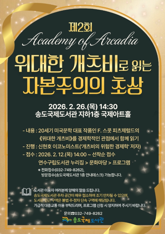 [메이저뉴스] 연수구 송도국제도서관은 오는 26일 14시 30분, 인문학 프로그램 ‘제2회 아카데미 오브 아르카디아(Academy of Arcadia)’를 개최한다.