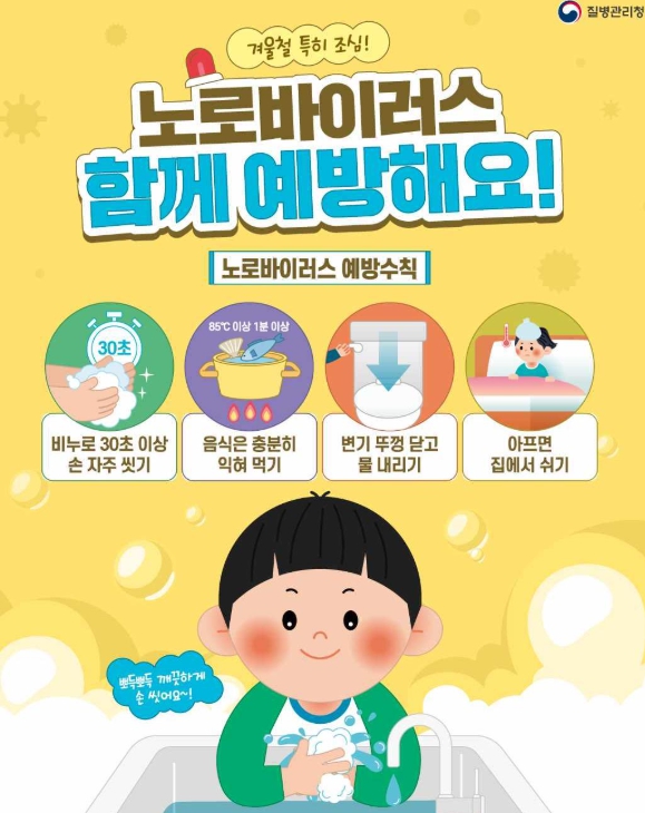 이를 예방하기 위해 ▲외출 후·식사 전·배변 후 비누를 사용한 30초 이상 손씻기 ▲음식물 충분히 익혀 섭취하기 ▲구토·설사 증상이 있는 경우 증상 소실 후 48시간까지 등원·등교·출근 자제 ▲환자 발생 시 구토물 및 접촉 환경에 대한 염소 소독 등 예방수칙을 철저히 준수하는 것이 중요하다.
