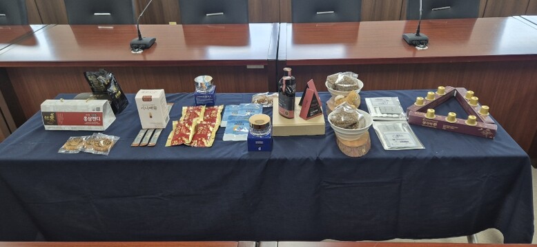 | ▲ 지난 23일 금산인삼약초산업진흥원에서 열린 지역식품표준화사업 연구 성과 활용 관리 및 신규 사업 추진보고회 및 개발 제품들 |