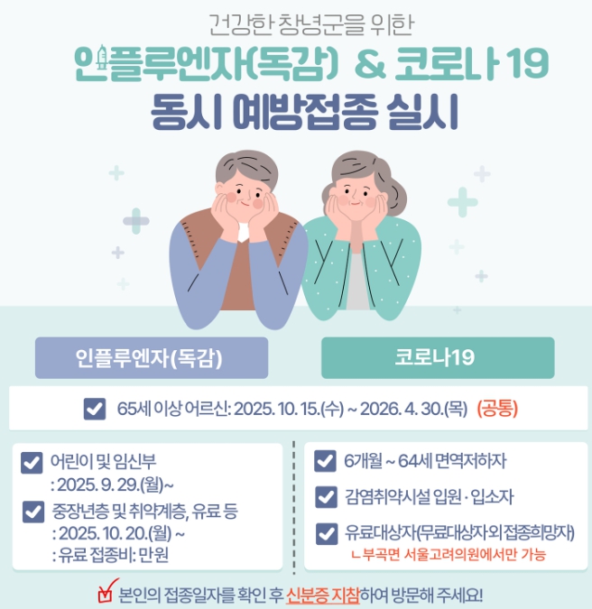 [메이저뉴스]창녕군은 65세 이상 어르신을 대상으로 내년 4월 30일까지 ‘25-26절기 인플루엔자 및 코로나19 동시 예방접종’을 실시한다고 밝혔다.