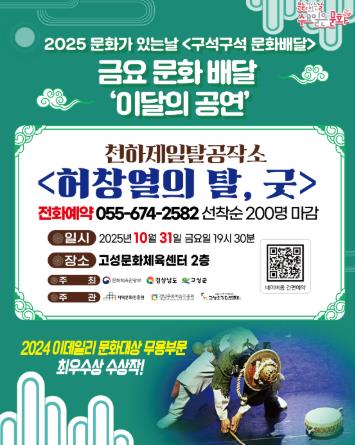 [메이저뉴스]고성군은 10월 31일, 고성군 문화체육센터 공연장에서 2025년 문화체육관광부 공모사업으로 선정된 ‘문화가 있는 날 구석구석 문화배달사업’의 10월 공연으로 천하제일탈공작소의 “허창열의 탈, 굿”을 선보인다.