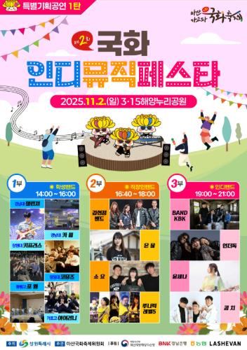 [메이저뉴스] 창원특례시는 오는 11월 2일, 국화 향기가 가득한 3·15해양누리공원에서 지역 밴드와 인디뮤지션이 함께 꾸미는 ‘국화 인디뮤직페스타’를 선보인다고 밝혔다.
