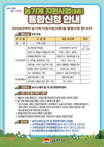 [메이저뉴스]김천시는 지역 농업인을 대상으로 ‘2026년 농기계 지원사업(9종)’ 신청을 오는 2026년 1월 30일(금)까지 농지소재지 읍면동 행정복지센터에서 접수한다고 밝혔다.