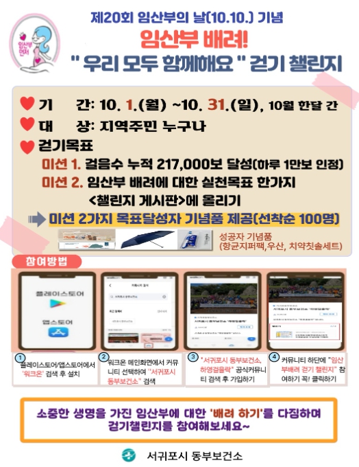 [메이저뉴스]서귀포시 동부보건소는 오는 10월 10일 제20회 임산부의 날을 맞아 임신·출산에 대한 긍정적 인식 고취 및 임산부가 배려 받는 사회 분위기 조성을 위해 ‘임산부 배려 걷기 챌린지’를 실시한다고 밝혔다.