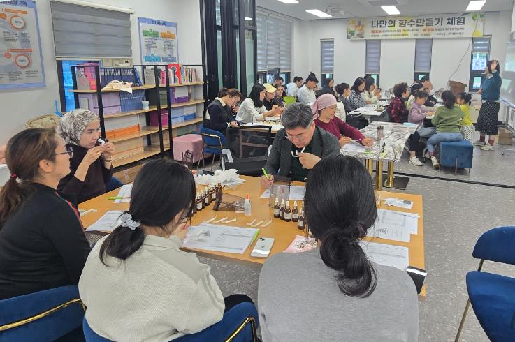 [메이저뉴스]영암군외국인주민지원센터가 26일 삼호읍 센터에서 외국인주민이 참여하는 ‘나만의 향수 만들기’ 체험 프로그램을 진행했다.
