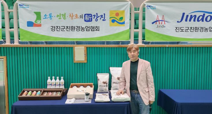 | ▲ 강진에서 생산된 유기농 ‘음악 듣고 자란 쌀’과 함꼐 행사에 참여한 김현우 대표 |