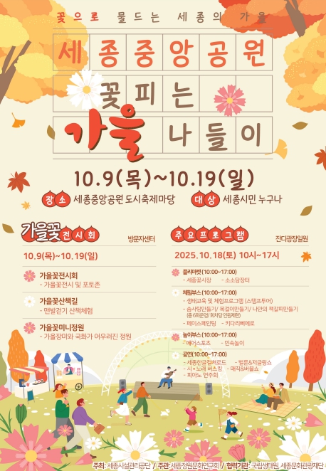 ‘꽃으로 물드는 세종의 가을’을 주제로 열리는 이번 행사는 시민에게 풍성한 여가와 체험의 기회를 제공하고, 지역 농가와 예술인 참여를 통해 지역경제 활성화에도 기여할 전망이다.