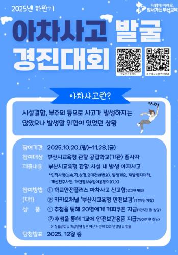 [메이저뉴스]부산광역시교육청은 지난 20일부터 다음달 28일까지 관내 학교(기관) 근로자를 대상으로 ‘하반기 아차사고 발굴 경진대회’를 개최한다고 29일 밝혔다.