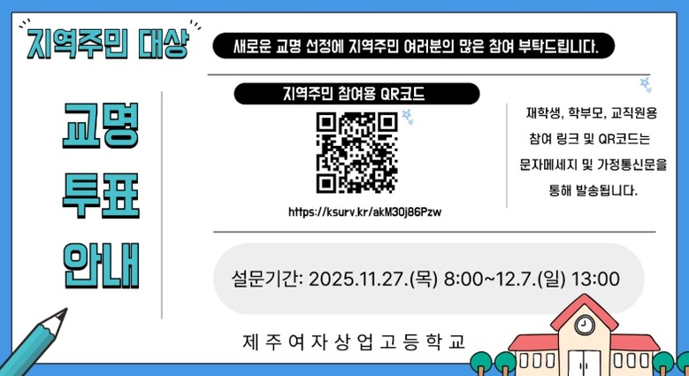 [메이저뉴스]제주도교육청 제주여자상업고등학교는 2027학년도 일반고(남녀공학) 전환에 따라 실시한 학교명 공모 결과를 심사해 최종 3개 후보를 선정하고 이에 대한 온라인 설문조사를 27일부터 내달 7일까지 진행한다.