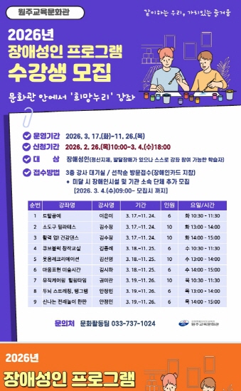 참가 신청은 2월 26일 오전 10시부터 원주교육문화관 3층 강사대기실에서 가능하며, 신청 시 장애인카드를 지참해야 한다.