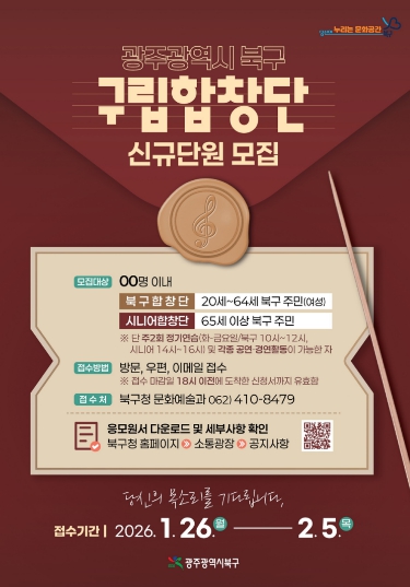 [메이저뉴스]광주광역시 북구가 아름다운 목소리로 주민들과 소통하는 구립합창단 신규 단원을 모집한다고 21일 밝혔다.
