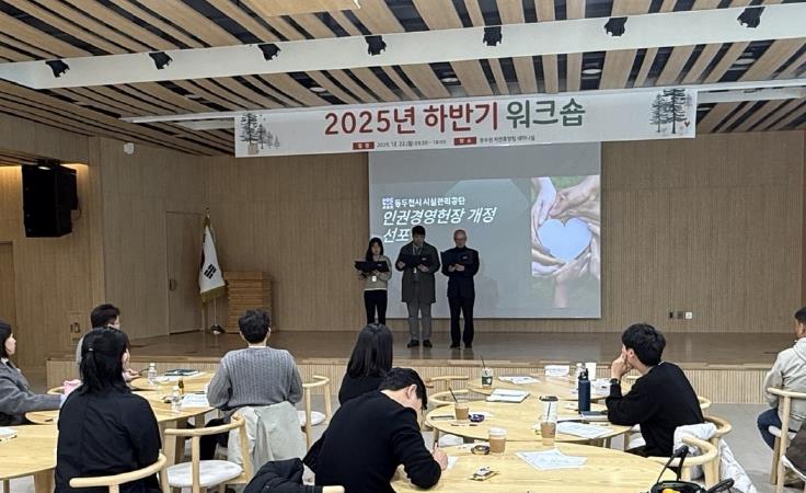 [메이저뉴스]동두천시 시설관리공단은 지난 22일 동두천 자연휴양림 세미나실에서 열린 2025년 하반기 워크숍에서 인권경영 헌장 개정 및 선포식을 개최했다고 밝혔다.