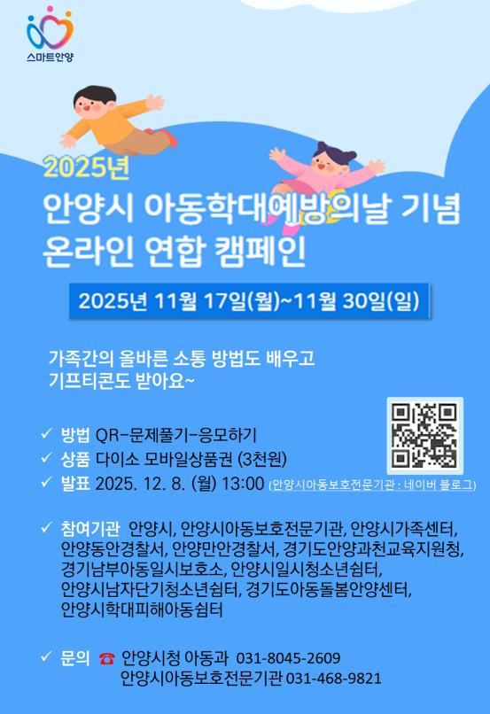 최대호 안양시장은 “우리의 관심이 아이들의 행복을 지킬 수 있다”면서 “온라인 캠페인을 통해 더 많은 시민이 아동학대 예방과 신고에 동참하는 계기가 되길 바란다”고 말했다.