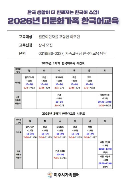 2026년 다문화가족 대상 한국어 교육은 2월부터 11월까지 연중 운영되며, 학습자 욕구에 맞춘 수준별 교육과정으로 신청이 가능하다.