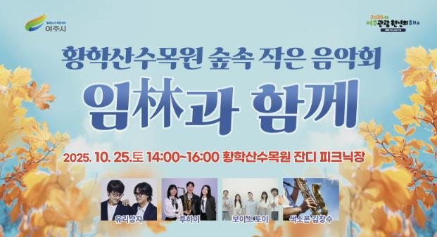 [메이저뉴스]여주시는 오는 10월 25일 오후 2시부터 4시까지 황학산수목원 잔디피크닉장에서 ‘임(林)과 함께’ 음악회를 연다고 밝혔다.
