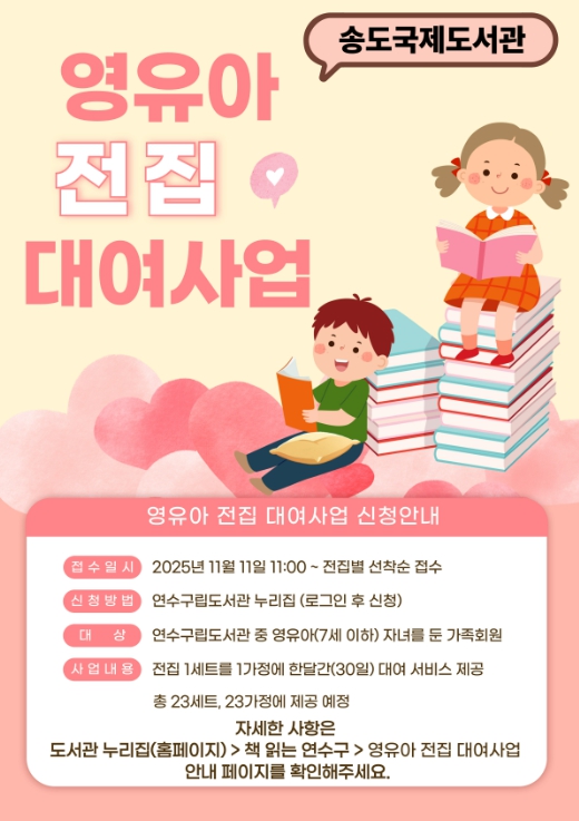 [메이저뉴스]연수구송도국제도서관은 오는 11일부터 7세 이하 영·유아 가정을 대상으로 ‘전집 대여 서비스’를 새롭게 운영한다.