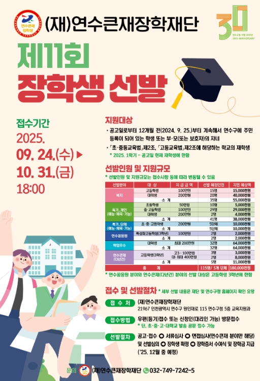 [메이저뉴스](재)연수큰재장학재단은 미래 지역사회를 이끌어 갈 우수 인재 발굴과 양성을 위해 제11회 장학생을 선발한다.