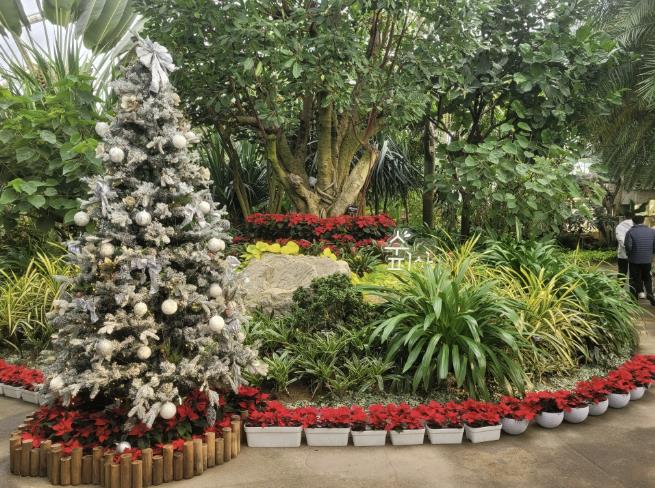 전시 공간에는 포인세티아, 시클라멘 등 겨울을 상징하는 식물들이 배치됐으며, 입구에는 트리 장식이 설치돼 관람 동선을 따라 식물을 감상할 수 있도록 구성했다. 이에 더해 실내에는 스카이워크 난간을 활용한 꽃걸이 화분 등 다양한 형태의 식물 전시가 마련됐다.