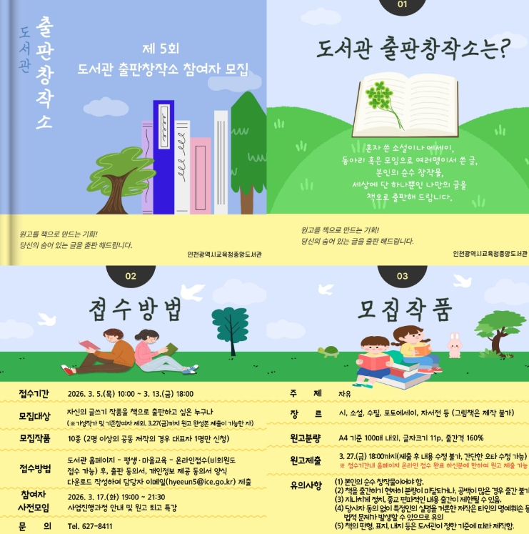 출판 경험이 없는 시민을 대상으로 3월 5일부터 13일까지 선착순 모집하며, 자세한 사항은 중앙도서관 정보자료과(032-627-8411)로 문의하면 된다.