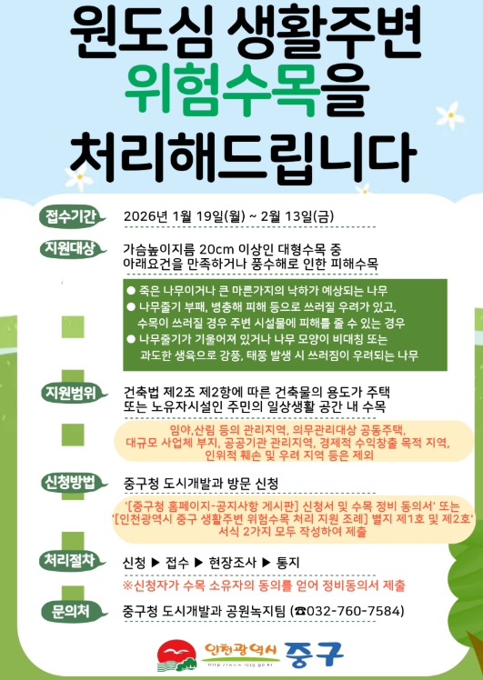 [메이저뉴스]인천시 중구는 원도심 권역을 대상으로 ‘2026년도 원도심 생활 주변 위험 수목 처리지원 사업’을 추진한다고 21일 밝혔다.