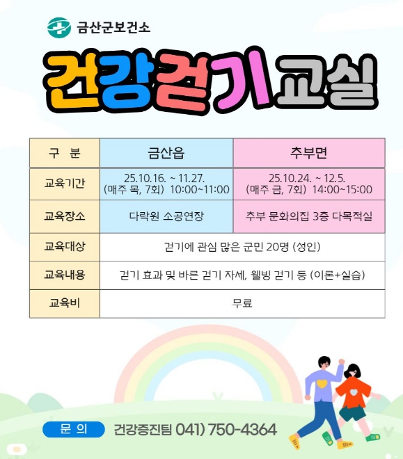 [메이저뉴스]금산군보건소는 군민의 건강증진과 생활 속 신체활동 실천을 위해 오는 12월까지 금산읍·추부면에서 건강 걷기 교실을 운영한다.