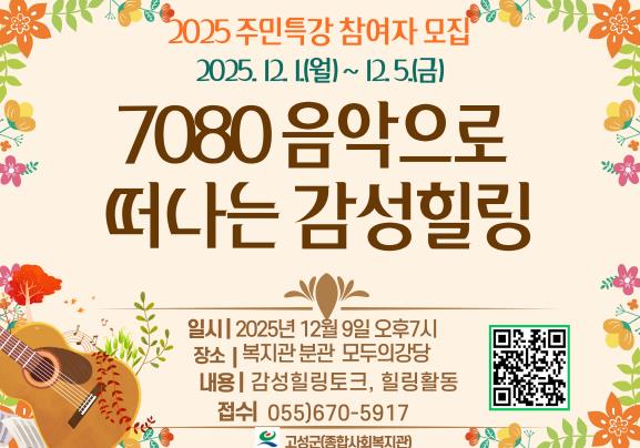 [메이저뉴스]고성군에서 운영 중인 고성군종합사회복지관에서는 2025년 12월 9일 19시 종합사회복지관 분관 모두의 강당에서 고성군민을 대상으로 7080 음악으로 떠나는 감성 힐링이라는 주제로 특강을 진행한다.