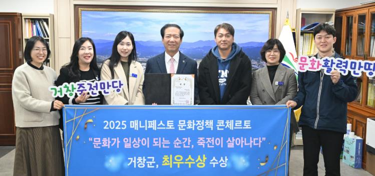 [메이저뉴스] 거창군은 강원특별자치도 원주시 상지대학교에서 개최한 ‘2025 전국 기초단체장 매니페스토 문화정책 콘체르토(Concerto)’ 대회에서 문화기반 도시활력분야 ‘최우수상’을 수상했다고 26일 밝혔다.