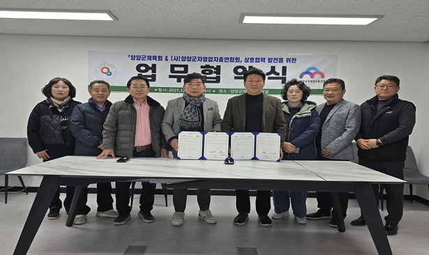 [메이저뉴스]양양군체육회와 (사)양양군자영업자총연합회는 지난 12월 3일에 지역 경제와 체육의 상호 시너지 효과를 높이기 위한 업무협약을 체결했다.