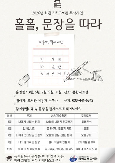 [메이저뉴스] 화천교육도서관은 오는 3월부터 11월까지 깊이 있는 독서문화의 확산을 위해 2026년 특색사업 ‘홀홀, 문장을 따라’를 운영한다.